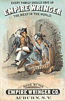 1915? I have found two colored cards advertising the Empire Wringer Company. The first pictures a ram marrying two foxes in a small gathering of animals. The second pictures mother and father fox with their baby fox in a kind of bassinet. The first card comes from an unknown source and the second from William Phillips of Lewiston, ME, through eBay, Jan., '03.