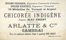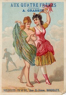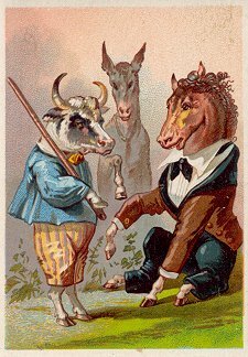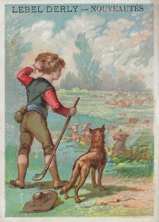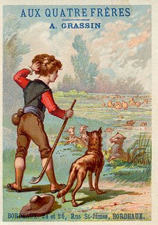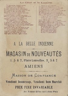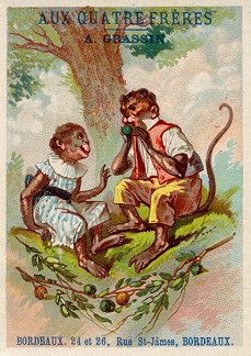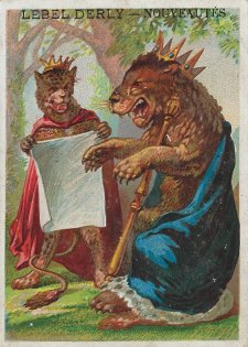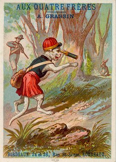 1880? 7 cards depicting fables of Florian, including a text of very small print in two columns at the top of the back of the card and a simple colored picture on the front. 4 3/8" x 3 1/8". Most recently, 6 full-sized cards for 60 Francs each from Annick Tilly at the Clignancourt flea market, August, '99. The other "Aux Deux Magots" card cost $4 from Clipper Cargo at the Sacramento Paper Show, Dec., '96. Six other cards, cropped, cost 140 francs at the Clignancourt flea market, Paris, May, '97.