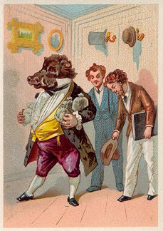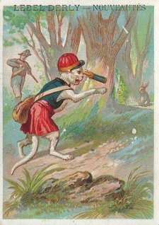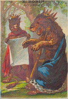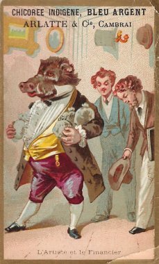 The first six from Clignancourt are cropped. At present I have full versions of all seven cards except "Le Lion et le Léopard," for which my only examplar is cropped. How wonderful to have something from an institution like "Aux Deux Magots" right at St. Germain des Pres! The colors are strong and the animals well dressed. Most humans would need a magnifying glass to read these fable texts! They were kept deliberately small, one suspects, to make room for the advertiser's information. "La Guenon, le Singe et la Noix" may have the strongest illustration of the lot. The printer for both LP and ER is "Publicité Roussette, 65 Faub. St. Denis, Paris, while the printer for AQF and ADM is "Ass. d'Ouv. lith., Romanet et Cie, 27bis, r. Corbeau. While some cards have only the image on one side and the text of the fable with its title on the other, the other cards represent several advertisers. - 1890? Here is a mystery. The same image as "le sanglier et le rossignol" is presented in this unusual card as "L'Artiste t le Financier." No one has been able to point me to a text with this name or even subject. It took more than a little hunting to recognize where in our collection these Florian images have occurred.