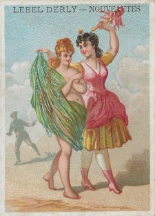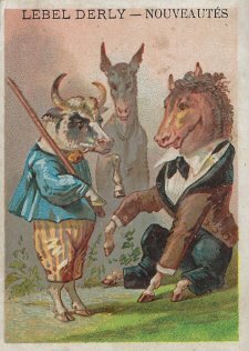 1880? 6 cards depicting fables of Florian, including a text of very small print in two columns at the top of the back of the card and a simple colored picture on the front. 4 3/8" x 3 1/8". All advertise "Lebel Derly -- Nouveautés." €45 from Albert van den Bosch, Antwerp, June, '23.