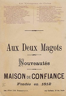 - Most recently, 6 full-sized cards for 60 Francs each from Annick Tilly at the Clignancourt flea market, August, '99. The other "Aux Deux Magots" card cost $4 from Clipper Cargo at the Sacramento Paper Show, Dec., '96. Six other cards, cropped, cost 140 francs at the Clignancourt flea market, Paris, May, '97.
