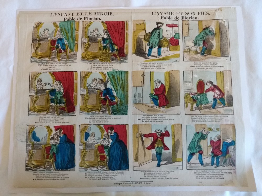 1880? Two fables of Florian. Broadside. "L'Enfant et le Miroir" and "L'Avare et son Fils." 15” x 12.5.” Metz: Gangel. €20 from chcestampnet through Ebay, Jan., '22.