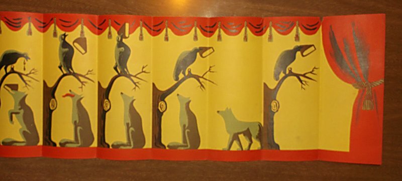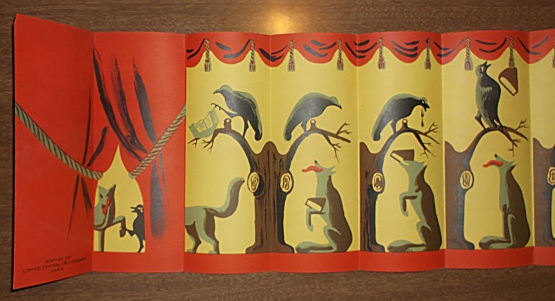 Here is an ingenious piece of ephemera. One opens a brochure somewhat smaller than 10" x 4". As one opens, scenes open and succeed each other, each with a portion of La Fontaine's "Fox and Crow" on a facing text page. There are two double panels, five single panels, and a final double panel. The first double panel opens a curtain on a crow with a piece of cheese perched in a tree. The second double panel first shows a fox approaching and then, as one opens further, shows him beneath the crow. The first single panel has the crow holding the cheese high. In the next, the cheese is out of the crow's beak, and the tongue is out of the fox's mouth! The next panel shows tears -- or saliva? -- falling from the crow. One more panel shows the fox holding the cheese below an expressionless crow. In the final single panel, the fox is exiting, and the crow seems to be reading a bible on his branch. The last double panel provides a curtain call for the two characters. The fun lies in folding open one panel at a time and finding the appropriate verses and scene. Lovely use of red, brown, black, and green. I am not sure whether to list this lovely piece as a book or a brochure, so I will do both! - Source