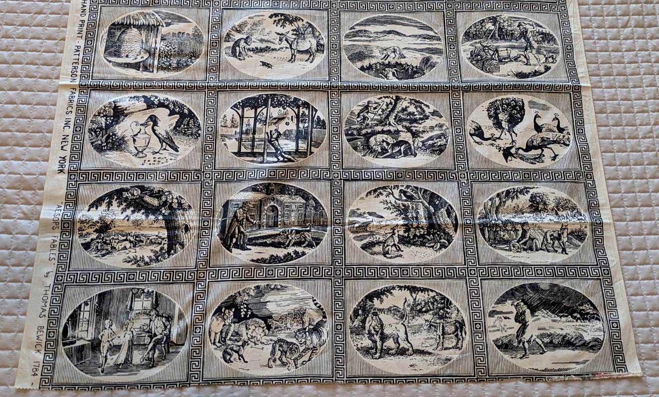 1980? “Aesop’s Fables Thomas Bewick 1784” hand print by Patterson Fabrics of NY. About 3’1” square. Source unknown.
