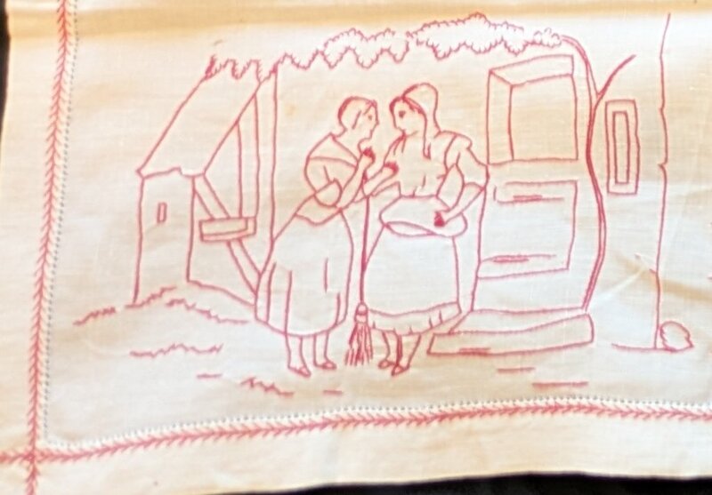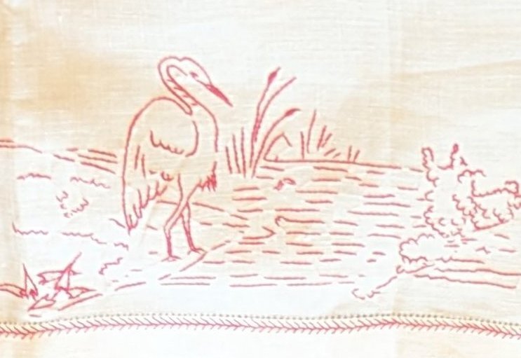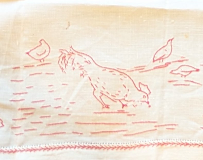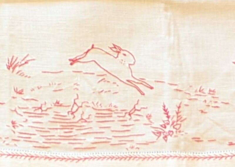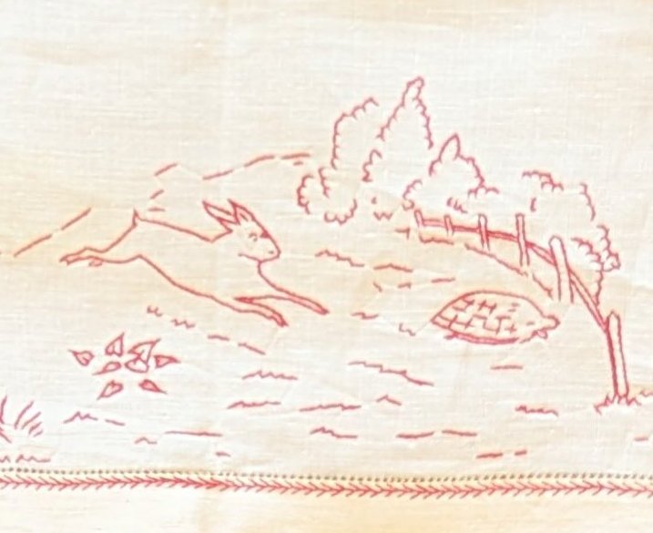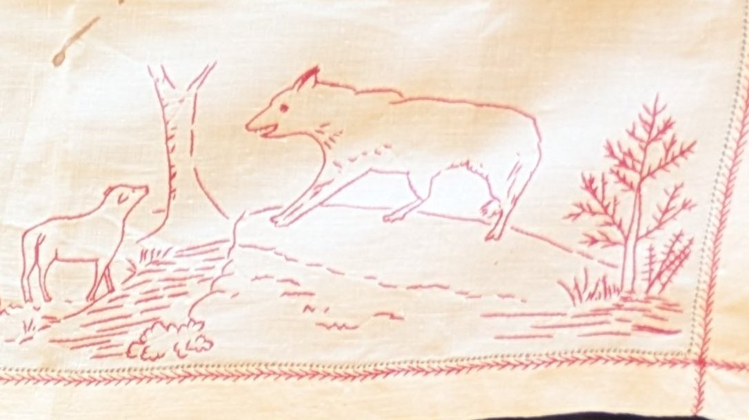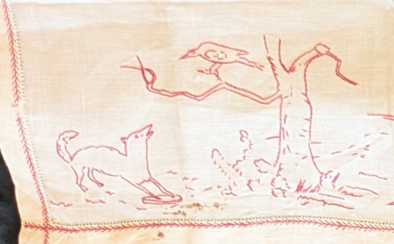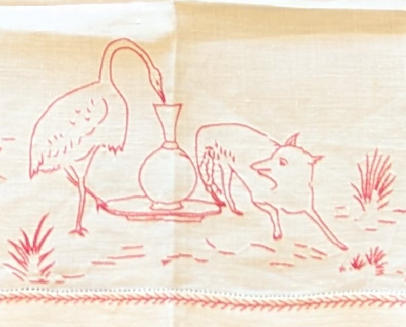 This piece of cloth features two rows of distinctive fable scenes. One row features, from left to right, FC; "The Heron"; MM; TH; and WL. If we turn it over and again proceed from left to right, we have "The Secret"; CJ; FS; "The Hare and the Frogs"; and MSA. Some scenes are more skillfully rendered than others, but overall it is a lovely piece! - Date