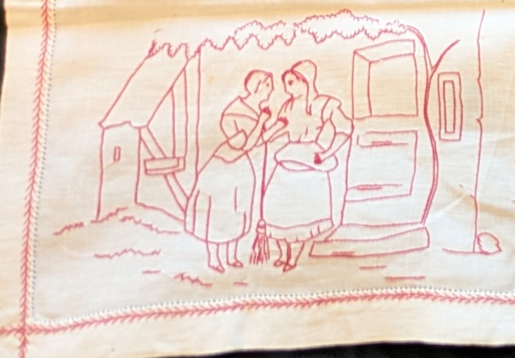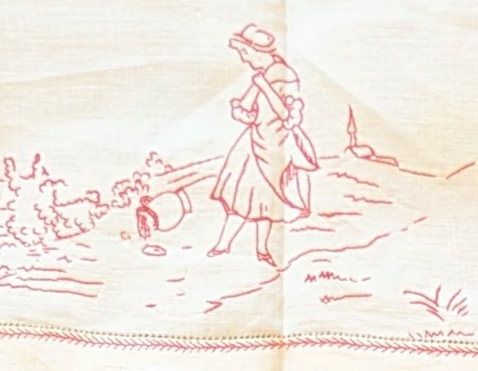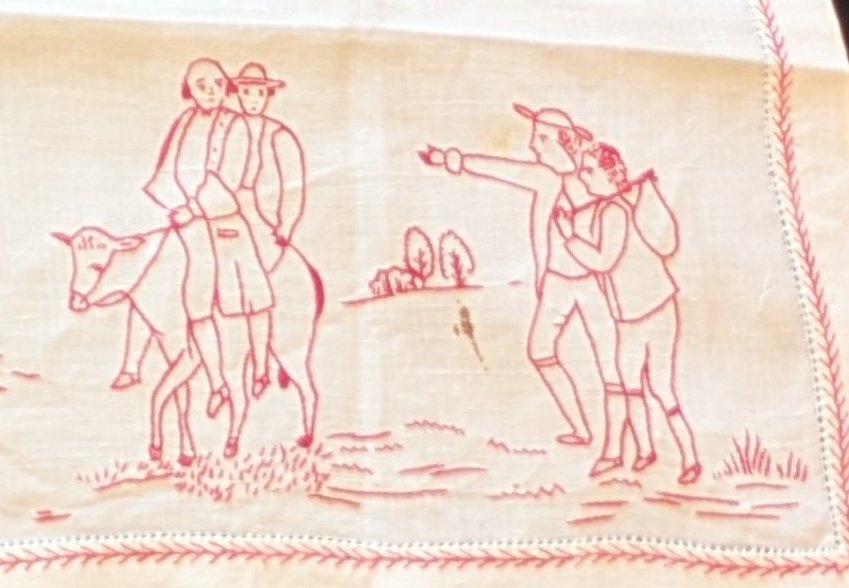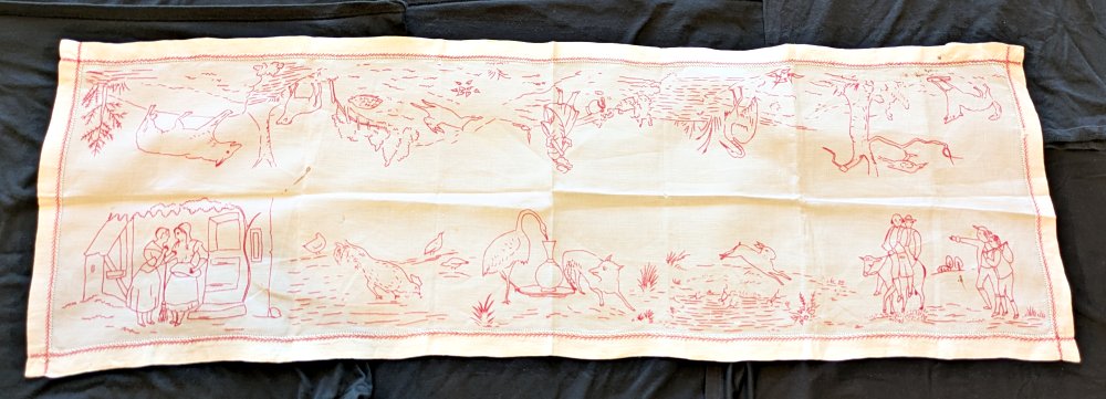 1980? Red and white runner featuring ten fable scenes. 44.5" x 14.5”. Source unknown.