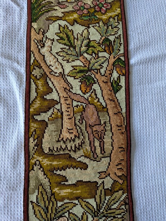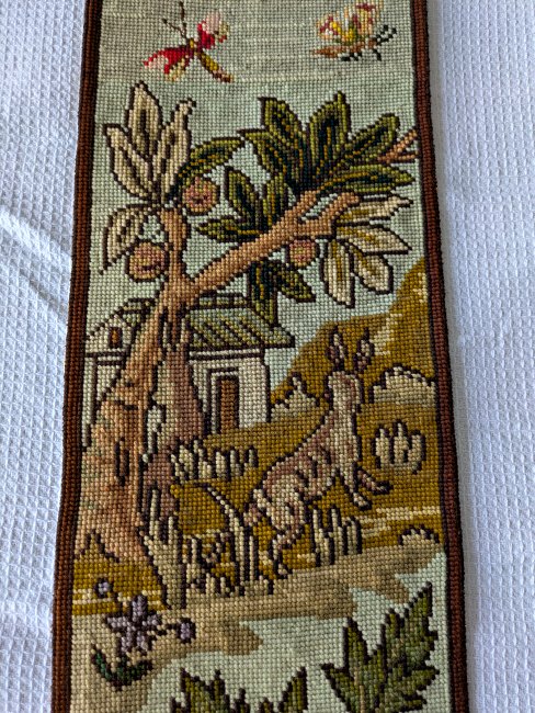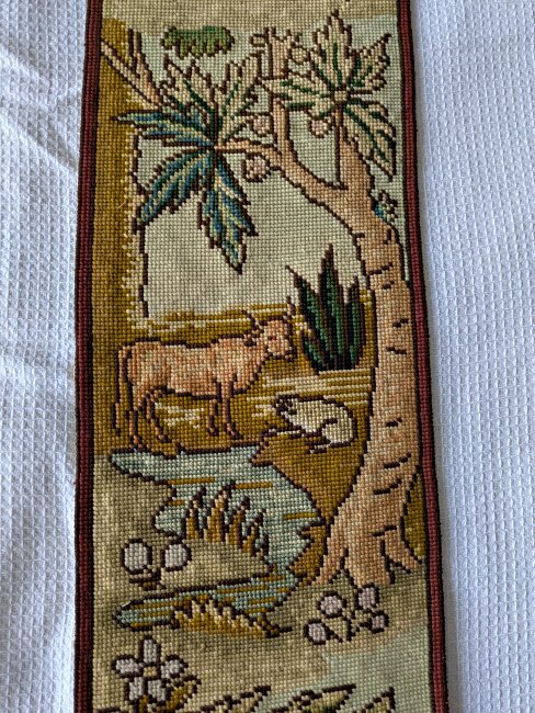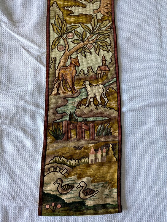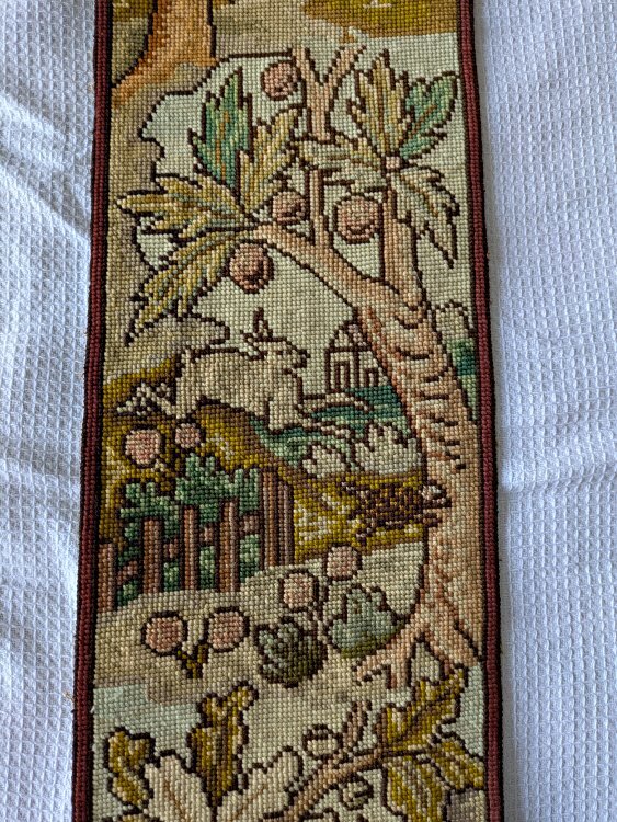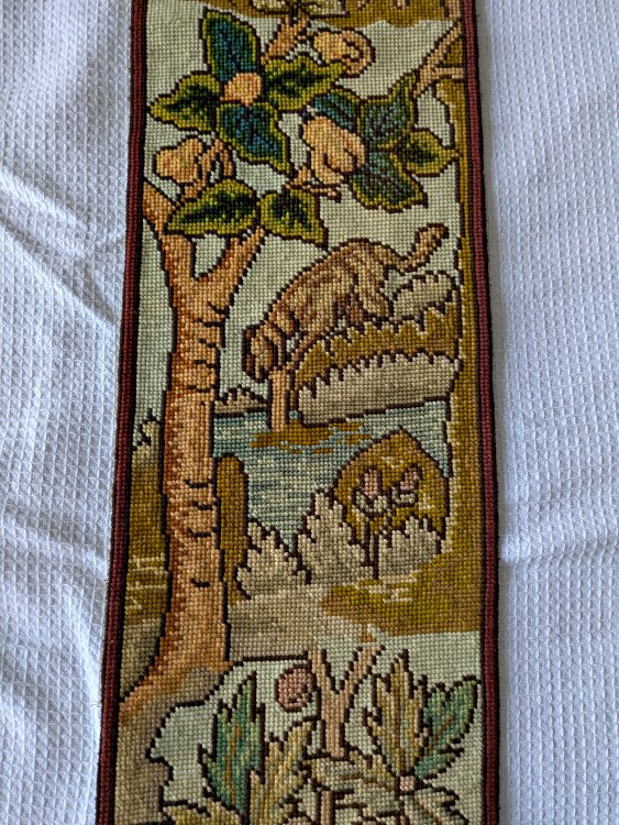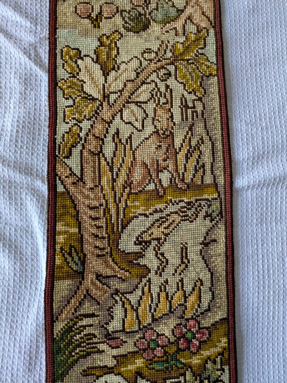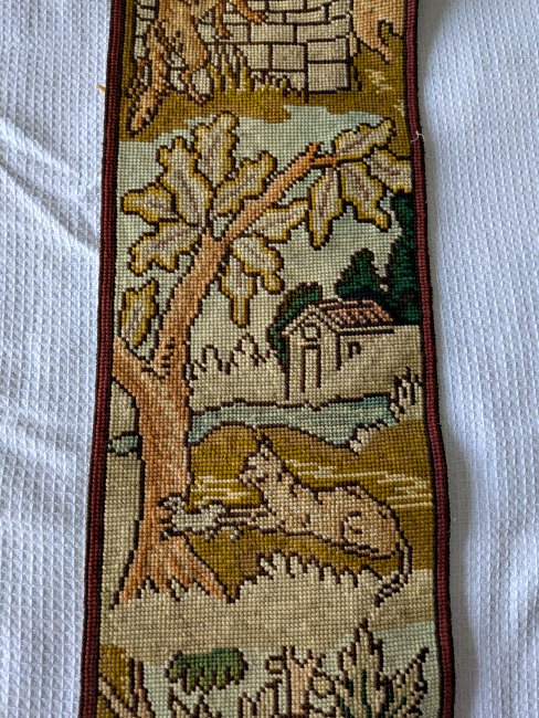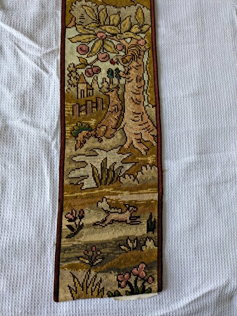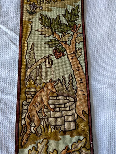 Each of these long, slender, exquisite tapestries contains six fable scenes. The style is similar to that on our wider tapestry, but strangely none of the twelve scenes presented here are the same as the seven there. Two of the images here are unclear to me. I would love to have help in deciphering them! The first image here shows them as they stood at the entrance to an on-campus exhibit of the fable collection, "Thundering Tortoises and Horrified Hares," in January, '18. - Date
