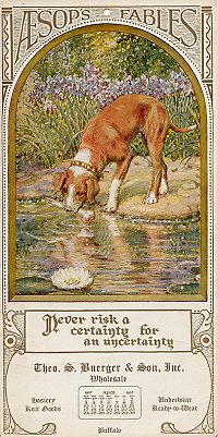 April, 1927 calendar titled "Aesop's Fables," with a good, round-top illustration of John Rae's "The Dog and His Image" and the moral "Never risk a certainty for an uncertainty." The illustration may have appeared first in Fables in Rhyme for Little Folks (Adapted from the French of La Fontaine. Written by W.T. Larned. Illustrated by John Rae. Chicago: P.F. Volland Co. 1918). See my reprints of the book under 1918/35? and 1918/50. - Source