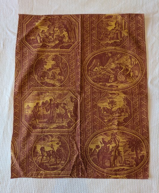 This is a smaller section of the same pattern as just above, including only the basic pattern of eight fable scenes. The hue here has more red than the larger section's brown. Someone has hemmed this segment very nicely with gold thread. This smaller segment lacks the identifying signature of the larger piece above. - Date