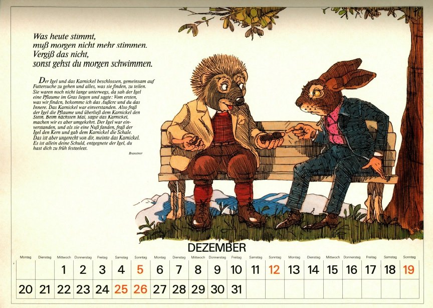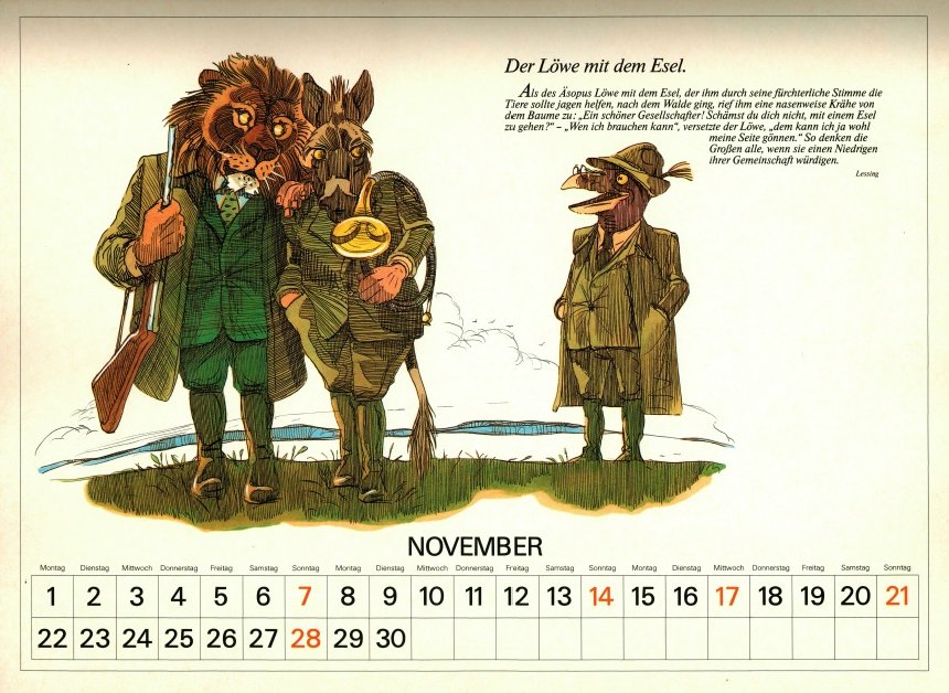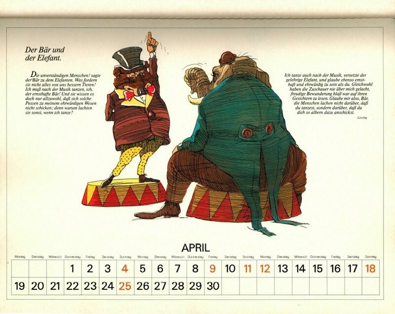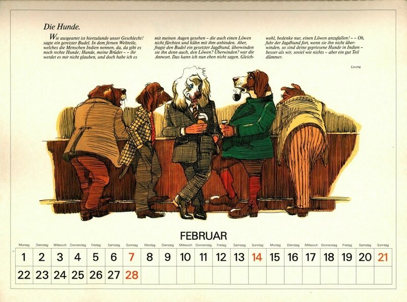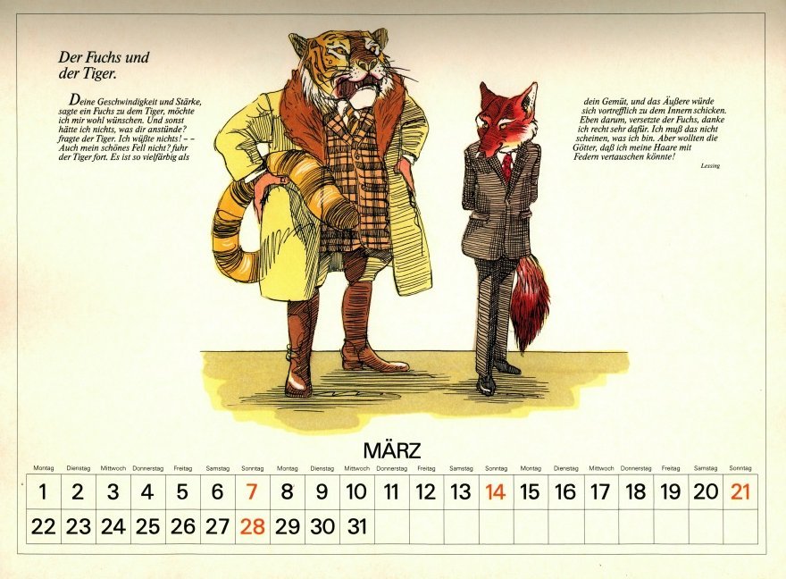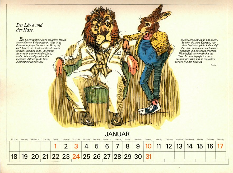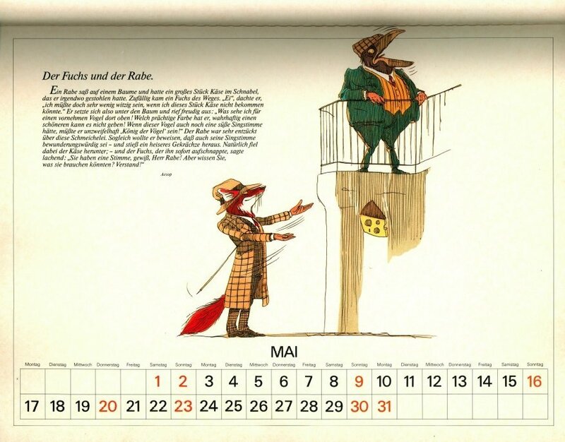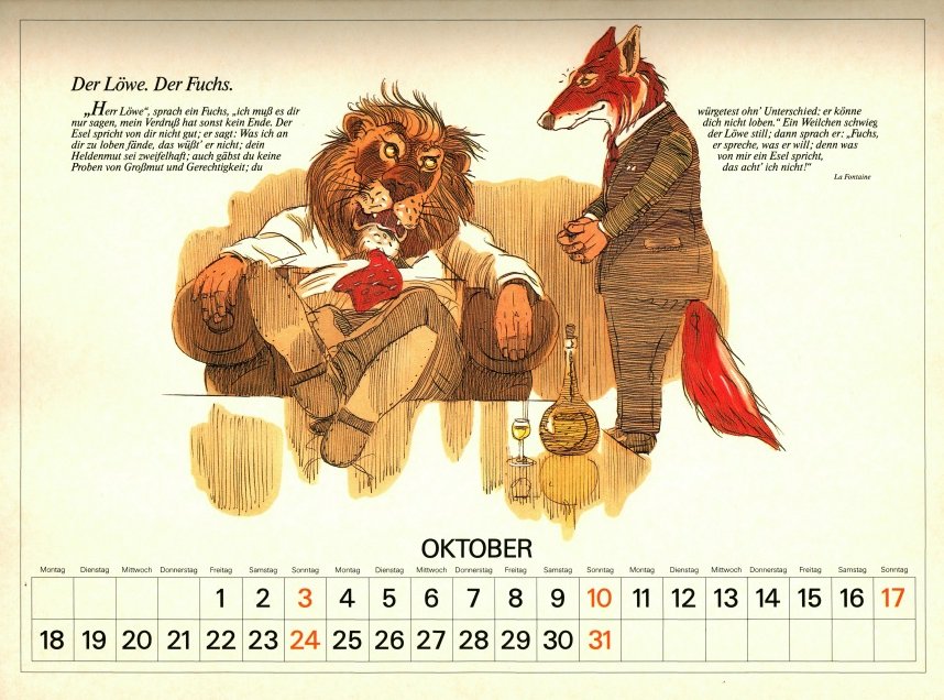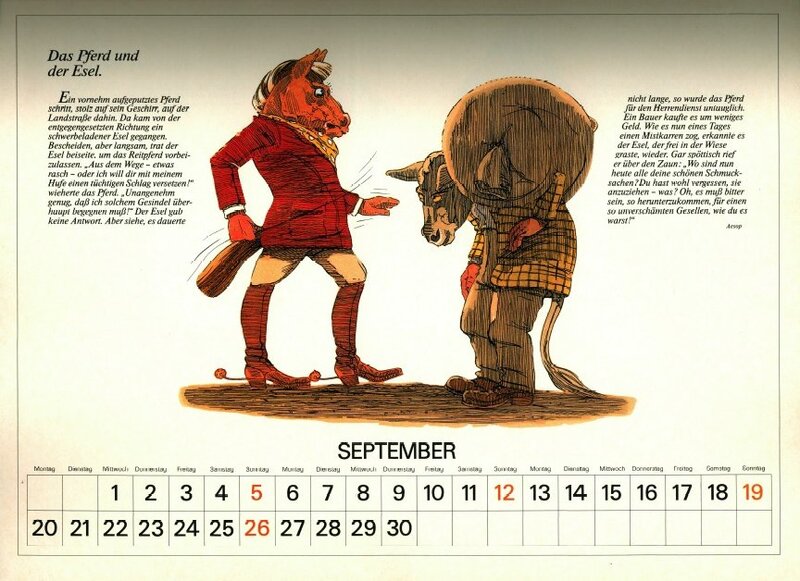 Delightful, playful illustrations in contemporary vein, with characters dressed in human clothes. May has FC, June a very good FS, July "The Dog and the Rabbit," August LM, and September "The Horse and the Ass." To see some months of this lovely calendar, click on the image below. - Date