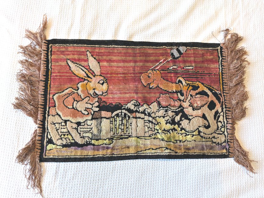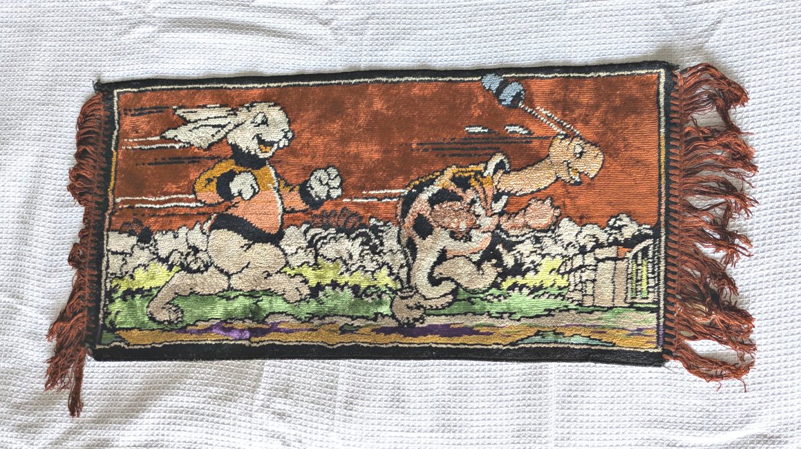 These rugs with fringe on their sides clearly belong to the same series as those above. One featuring the main two characterrs reverses the direction of its twin above. The other presents an unlikely scene of the tortoise and one of Miss Cottontail’s female students running in the same direction. Both are 11.25” high. Their widths are 24” (the mirror view twin) and 18”. Might these have been movie prizes or lottery gifts for viewing the cartoon? - Date