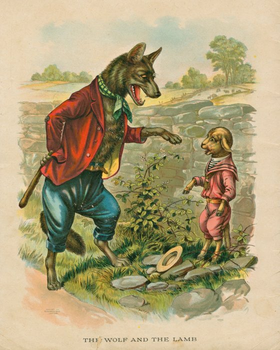 Gorgeous color work of the lamb, a crying child, backed up against a wall. The ed-eyed wolf points an accusing paw at this child.