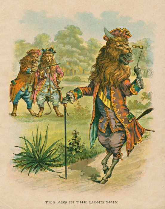 The spectacles are the crowning feature of this satirical illustration. Two aristocratic lions in the background point a hand in criticism. Though beautifully decked out in a combination of aristocratic finery and the lion’s skin, the ass manages to look through the lion’’s eye-holes – or perhaps to fake it? Gorgeous color lithography! - Date