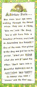 2002? Birthday greeting card "A Birthday Fable." 8¾" x 4". Made in U.S.A. Kansas City, MO: Expressions from Hallmark. $1 from Sheryl Weilgosh, Oklahoma City, OK, through eBay, Jan., '04.