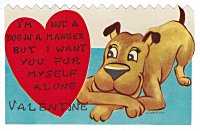 1970? One valentine proclaiming "I'm not a dog in a manger but I want you for myself alone. Valentine." Made in U.S.A. $2.95 from Trish Rucker at Birdhouse Books, Decatur, GA, through eBay, Jan., '18.
