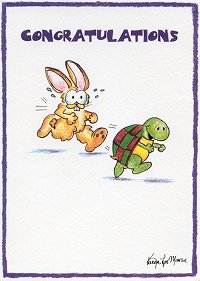 1998? "Congratulations" portrait-formatted greeting card. The front shows a sweating hare trying to catch up to a running tortoise and says "Congratulations." Inside reads "You've really pulled ahead!" ©Karen Lyn Morse. Printed in U.S.A. Animal Crackers. Boulder, CO: Blue Mountain Arts. Gift, June, '99.