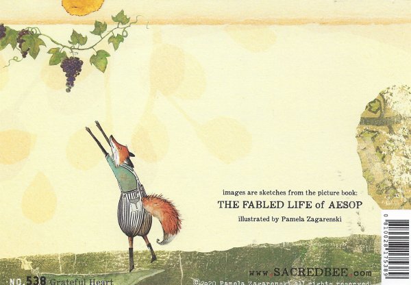 2020 Gratitude greeting card. "The grateful heart will always find opportunities to show its gratitude. Aesop." Sketches from "The Fabled Life of Aesop" by Pamela Zagarenski. No. 538. Signed by the senders, Paul and Ianthe Swensen, Dec., '21.