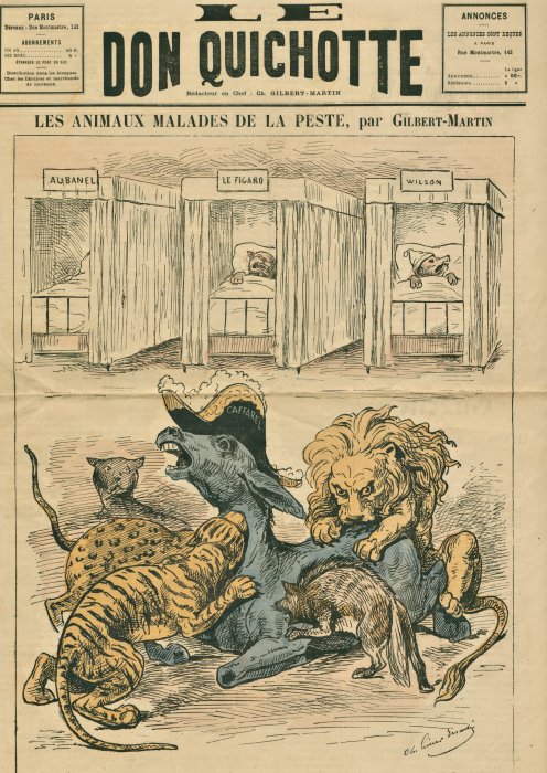 Again here, a dramatic image by the paper’s editor on its front page is matched by a “Gazette” poem on the second page. Caffarel is the poor donkey devoured by the guiltier animals for his minuscule transgression. - Date