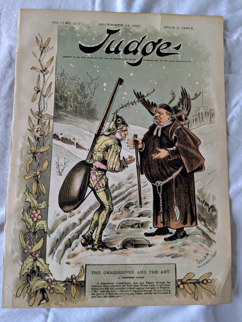 1887 “Judge” Magazine cover for December 24, 1887. “The Grasshopper and the Ant.” “Bernhard Gillam, with apologies to Vibert.( Vol. 13, No. 323. Unknown source.