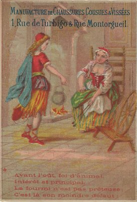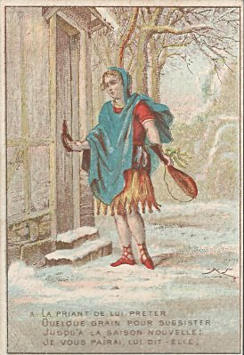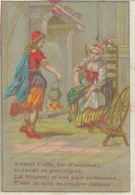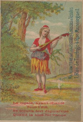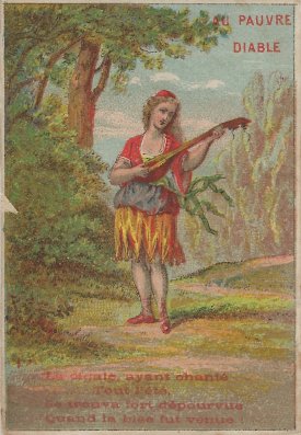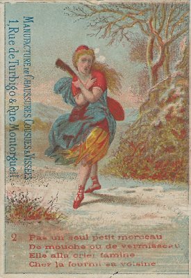 1910? Set of five GA trade cards. Two multi-colored cards featuring a young woman as the cicada in the cold and then knocking at the ant's door. Four verses of La Fontaine's fable are on the image side of each card. Earlier: "Au Gagne Petit." The second card is from C. Remontey in Paris and was printed by Clamaron. €5 in St. Ouen, June, '19. Cards #1 and #4 for €15 each from Albert van den Bosch, Jan., '23. Card 3 for €15 from Albert van den Bosch, Antwerp, June, '23. Four further cards, including one advertising Maison du Pauvre Diable, for €2 from marcel2795 on Ebay, August, '23.