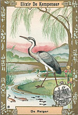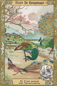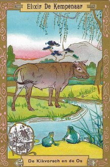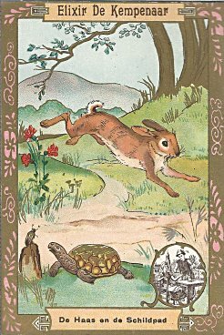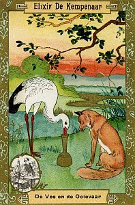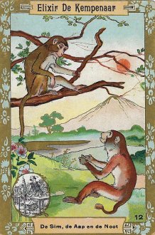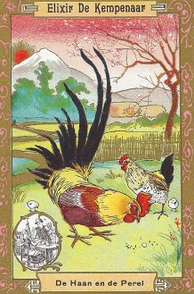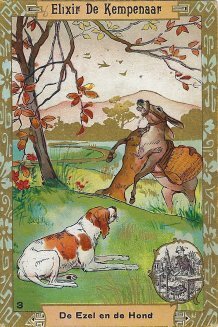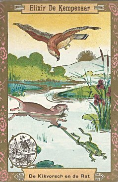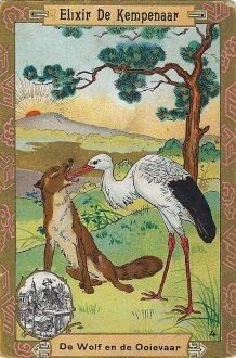 1900? 11 out of a series of 12 cards presenting fables of La Fontaine in an oriental style with Dutch text of the fable on the verso. "Elixir De Kempenaar." Druk J.E. Goossens, Brussels. Six of these for €16 each from Albert van den Bosch, December, '22.
