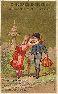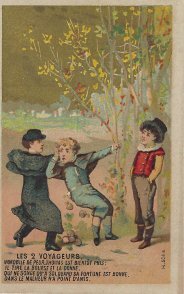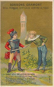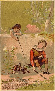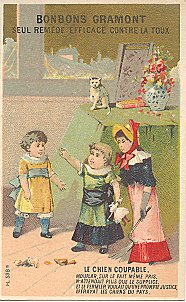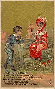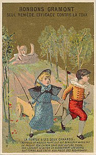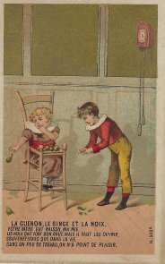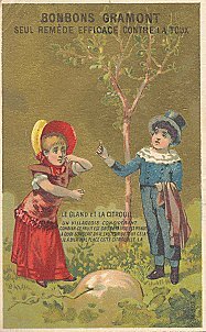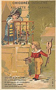 The Rodrigues set has no advertising on its illustrations, blank banks, and good condition. A golden sky marks each of these cards. Children act out scenes from La Fontaine's fables, from Florian's "Le Chien Coupable," (5.17), and from someone's "Le Chat et le Moineau." GA is a slightly different approach to the usual French presentation of this fable, perhaps since the actors are children. The music-player here is a young boy, and he has a violin rather than the usual guitar. Part of the cards' fascination seems to lie in dressing the children up. "Le Gland et la Citrouille" here introduces a second character. Is a smart young man explaining to a young woman that there are reasons why acorns should go with oaks? Is that candy that the little girl in FC has in her hand? How well does this illustration work on a card that ends up advertising chocolate? The script here is all capitals. Of the other cards than Rodrigues', four cards have "Bonbons Gramont" imprinted on the front ("Seul Rem ède efficace contre la Toux"!). Their backs have a uniform brown-ink advertisement for Bonbons Gramont. Three have "H 597 a" printed on the picture side, and the other has "H598 b." Two cards have "Chicorée Indigène/Arlatte & Cie, Cambrai" printed on the front. They both have "H 597 a" printed on the front, and they have a uniform black-print advertisement for the product on the back. Two cards have nothing stamped on the front, have one each "H 597 a" and "H 598 b" on the picture side, and offer a uniform advertisement in black ink on the back for Chocolaterie de l'Eure, à Menilles près Pacy-s/-Eure. Finally, the cropped card, like its larger version, has "H 597a" on the front but has no other markings, front or back. For an even fuller selection of these cards, consult Debauve & Gallais Cholocoate Cards. - Date