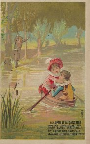1890? Complete set of 12 cards showing children in scenes from fables of La Fontaine, Florian, and perhaps others for $50 from Carlos Rodrigues, Montigny les Cormeilles, France, through Ebay, May, '22. Earlier 8 cards (plus one cropped extra of "Le Gland et la Citrouille") showing children in scenes from fables of La Fontaine, Florian, and perhaps others. A golden sky marks each of these cards. All but one credit as printer H. Laas, 16, rue Pierre-Levée, Paris. Eight cards for $40 from Bertrand Cocq, Calonne-Ricouart, France, March, '01. One cropped card for 40 Francs from Annick Tilly, Clignancourt, August, '99.