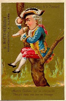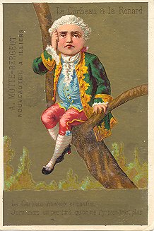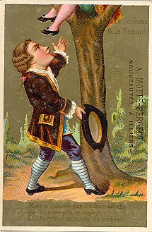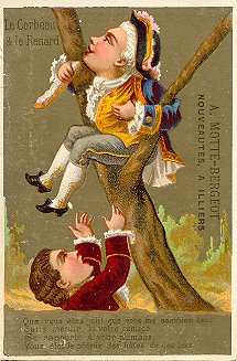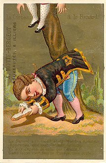 These are curious cards. The background is heavily gold with a few emblematic items, like a path and a few trees. The characters are all children highly dressed in adult clothing. Their faces form the focal point of each illustration. A particular curiosity of these portrait-formatted small cards is that the characters' clothing changes from card to card in the six moments of the story. Are we to think that a little troop of players are taking turns at acting out one scene each? The bottom portion of each picture page contains a few lines of the La Fontaine fable. This print, like the title at the card's top, is hard to read against the gold background. Each card in the Cocq set is stamped on the picture side with "A. Motte-Bergeot, Nouveautées a Illiers," which seems to sell furniture as well as men's, women's, and children's clothing. The text side of these cards is taken up completely with a uniform advertisement for Motte-Bergeot. I am especially impressed with the third card, on which "Renard" flatters the vain figure seated in the fork of the tree. - Date