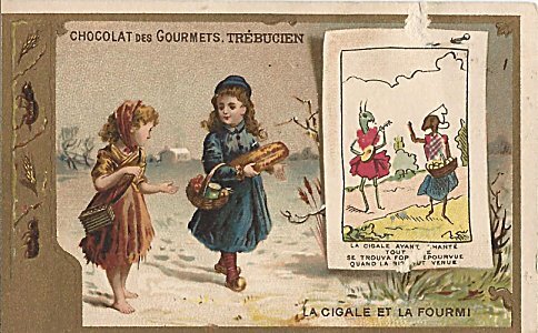 1890? 2 colored French cards picturing La Fontaine's "L'Huitre et les Plaideurs" and "Le Lièvre et les Grenouilles. " They are exactly in the format of the 1900 Liebig series "Favole di La Fontaine." The latter card reduplicates one there. The verso is blank on both of these cards. $20 from Bertrand Cocq, Calonne-Ricouart, Nov., '00. GA advertising Cafe des Gourmets; Café en Grains Trébucien; and Chocolat des Gourmets, printed byi Romanet et Cie., Paris, bought from an unknown source.