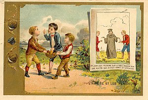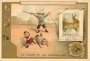 Is there any chance that "L'Huitre et les Plaideurs" belongs to one of the two earlier sets (1883 and 1896) of La Fontaine’s fables in the Liebig series? Might Liebig have sold the plates from its cards for use by others? "Le Lièvre et les Grenouilles" even has the title bar across the top in which "Vero Estratto di Carne Liebig" appears in the 1900 series. The colors have dulled on these cards. They are in fair to good condition. - Date