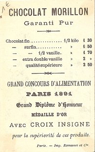 These three cards, #2, #4, and #5 of a set of six, are almost identical with the cards in Liebig's 1889 series of the same name. These cards are thinner by about a quarter-inch. They thus measure about 2½" x 4⅛". The artist here carefully removes from each scene the object that advertises Liebig. Thus in the second scene, the candle by which the milkmaid examines an egg rests not on a giant can of Liebig but rather on a vase. In the fourth scene, the can of Liebig resting up on a shelf has disappeared. In the fifth scene, the directional sign that once pointed to "Cie Liebig" now is blank. The title of the series and a short section of La Fontaine's text are printed near the bottom of each illustration. The backs of the three cards are identical. They advertise "Chocolat Morillon," guaranteed to be pure. Apparently Morillon won the golden medal, the "Grand Diplôme d'Honneur" at the Grand Concours d'Alimentation in Paris in 1891 for, as the card says, the superiority of its products. Prices for chocolate and vanilla are given. - Date