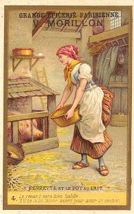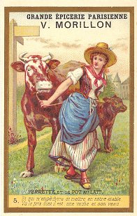 1891? Perrette et le Pot au Lait. Grande Épicerie Parisienne V. Morillon. Three numbered cards, each with a section of La Fontaine's text under the illustration. Publishers: Paris: Imp. Romanet et Cie. 3 Euros at Clignancourt, June, '07.