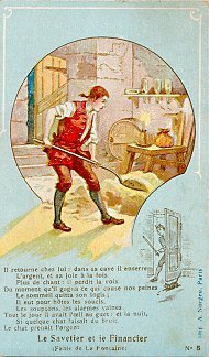 1890? 2 French cards of La Fontaine's fable "Le Savetier et le Financier." 2½" x slightly more than 4". Imp. A. Norgeu, Paris. $8 from Bertrand Cocq, Calonne-Ricouart, France, March, '01.