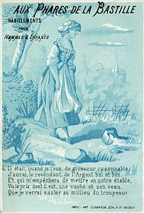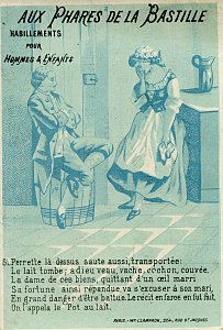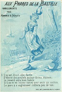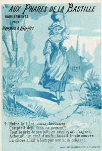 The pictures are monochromatic blue-and-white, with five or six lines per card at the bottom. The text and picture are not coordinated. In the text, for example, Perette is still thinking about cows when the picture already shows the milk fallen. The whole series ends with the line "They call it 'The Pot of Milk.'" This set is identical in picture with a set listed under "Clamaron," which remains the printer. But each card in this set is stamped "Aux Phares de la Bastille: Habillements pour Hommes & Enfants." A fuller advertisement for this shop is on each verso. These cards, by contrast with those, are numbered. - Date