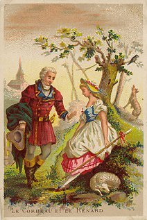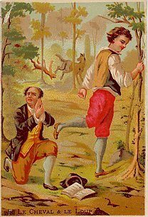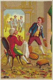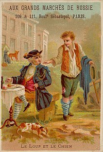 These are smaller-scale reproductions of four of the cards I have labeled as from Bouillon, Rivoyre et Cie. As there, the human scenes are provocative, as when a man of the road speaks with a well-dressed man in DW. One of the more suggestive fable cards I have seen is FC, in which a well dressed man is no doubt flattering a lovely shepherdess. I cannot construe what is happening in "Le Cheval & le Loup" beyond that a smirking young man is kicking a kneeling older man in the face. The verso of FC is blank. DW has "Aux Grand Marchés de Russie" on its picture side, and so it has advertising for the same firm on its verso. "Le Cheval & le Loup" advertises François Gianella in Dijon: "Spécialité de Chaussures in tous Genres." The printer of the latter card is A. Pitron, while L. Michel printed DW. Both are on the Boulevard des Italiens in Paris. "Le Cheval et le Loup" has been slightly cropped. TMCM has been cleverly transposed to the home of an aristocrat as he is about to be visited by armed soldiers. - Date