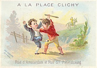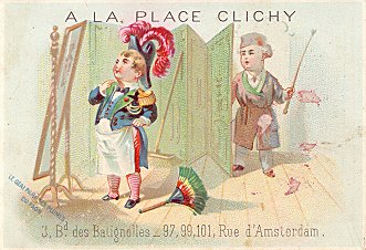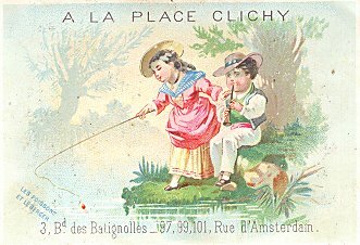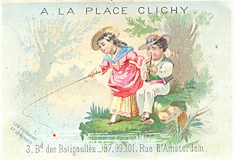 These are lovely cards. Each puts children into a landscape. Perhaps the finest is BF, which puts a rather rotund little fellow in military regalia in front of a mirror. By contrast, I am not sure if the world of children fits for portraying the stealing of a donkey! Though all four cards announce "A la Place Clichy" at the top of the picture side, BF and "Les Poissons et le Berger" speak then of an address on the Boulevard des Batignolles as well as three numbered addresses in the Rue d'Amsterdam. MM and "Les Voleurs et l'Ane" speak simply of the "Rue d'Amsterdam et Rue St. Pétersbourg" without giving any number addresses. - Date