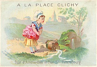 1890? 4 French full-color cards using children to depict various of La Fontaine's fables. 3" x 4 3/8". Each fable title is at a 45° angle in the lower left corner. "A la Place Clichy" is on the picture side and, along with the fable's text, the verso of each card. 80 Francs each from Annick Tilly, Clignancourt, August, '01. Extra "Les Voleurs et l'Ane" advertising "Aux Deux Passages" in Lyon for €5 from Simon Rodrigues through Ebay, June, '22. GA for €15 from Albert van den Bosch, Jan., '23.