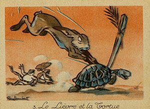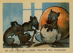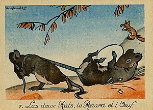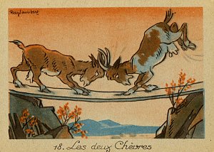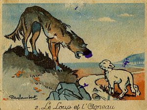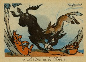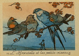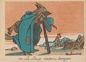 1910? Nine colored numbered cards signed by "Raylambert." The highest number here is "18." The verso of each repeats the number and offers La Fontaine's text. €1 for "14" at Paris Postcard Exhibit, Jan., '05. €1 for each of the others from Philippe Rault in Marche dauphine, Saint Ouen, August, '13.