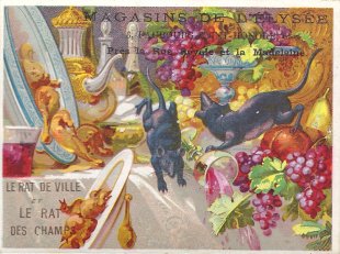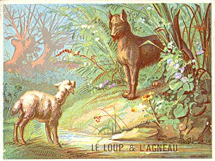 1895? 2 full-color landscape-formatted cards illustrating the La Fontaine fables "Le Lièvre et les Grenouilles" and WL. 3" x 4 1/8". Both display large block-print fable titles on the picture side. The former advertises F. Dupont in Calais and is marked "Lith. Van Seleyn (?)" with an indecipherable Paris address. $10 for the pair from Bertrand Cocq, Calonne-Ricouart, France, March, '01. TMCM for €5 from Simon Rodrigues, June, '22, along with an extra of "The Hare and the Frogs."