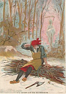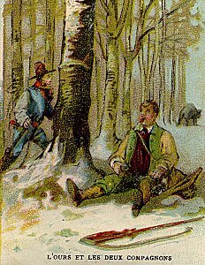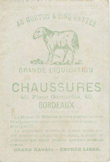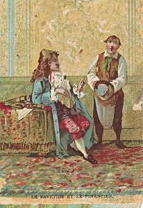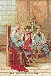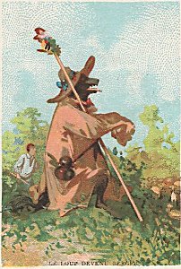 The cards have the strongest images in this set. They are also my clue to the identity of the papers, which are otherwise unmarked. HC is a curiosity. The card's picture is colorful but sketchy. The witty commentator wears a wide-brimmed hat as he speaks to the kneeling miser. Across the top of the picture is "Demandez la Chicorée extra 'LA SANS RIVALE' chez tous les épiciers." The back is covered with print and a picture of the chicory jar. ELR shows in its "Le Loup devenu Berger" how primitive the image work is here. Its clouds look like they bear a human fingerprint. One of the eight papers repeats this scene, in the same scale but--as is true of all eight--with a slightly larger image area and no border. All the papers except "Le Loup devenu Berger" have a blank verso. The papers are just over 2½ by just under 4". ELR is the same size overall, while HC, cropped, is slightly smaller. Two of them are torn: DLS and "Le Laboureur et ses Enfants." See the same cards presented differently under "Alcide Picard" and, among chocolate and chicoree cards, "Maison Salmon." "Alph. Babotte" also belongs to this group of images. - Date
