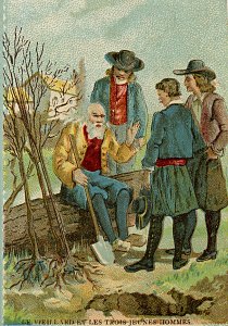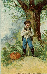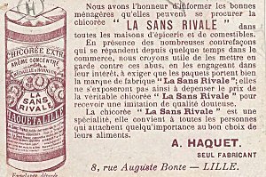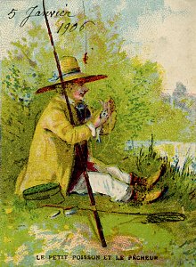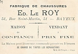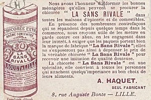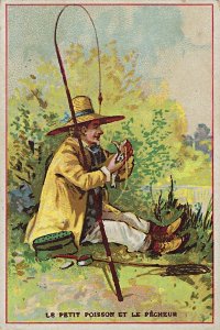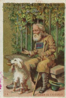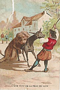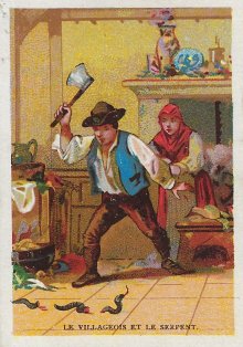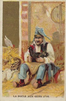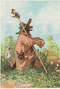 1895? Two cards and twelve additional slips -- plus several duplicates -- of thin paper (not cardboard) stock presenting La Fontaine's fables. One card, cropped, shows "L'Avare qui a perdu son Trésor" and advertises Haquet Chicory (HC) of Lille. The other shows "Le Loup devenu Berger" and advertises, on its verso only, Ed. Le Roy (ELR) of Bayeux, manufacturer of carriages. This latter card was printed by Leopold Verger of Paris. Two additional cards in St. Ouen for €10, June, '19, printed by Alice Picard without advertising, just the fable text on the verso. These two seem to have a different formatting for the fable title on the front of the card. The eight papers for $40 from Bertrand Cocq, Calonne-Ricouart, France, March, '01. HC for 45 Francs and ELR for 50 Francs from Annick Tilly, Clignancourt, August, respectively, of '99 and '01. Additional papers for €2 apiece at St. Ouen, August, '13. "Blind Man and Dog" for €5 from Bertrand Cocq, Sept., '20. GGE and "The Countryman and the Serpent" for €15 each from Albert von den Bosch, Jan., '23. One extra card of ""The Countryman and the Serpent" advertising A la Belle Jardiniere chicoree at C. Berliot in Lille for €1 from pier-mont through Ebay, Sept., '23.