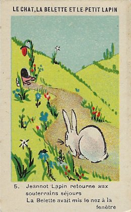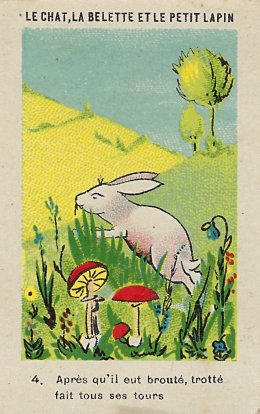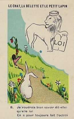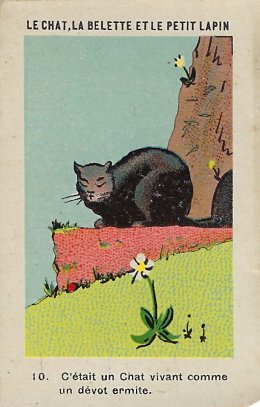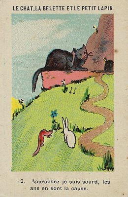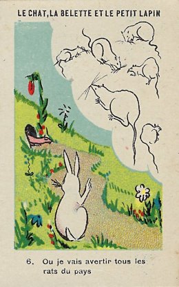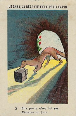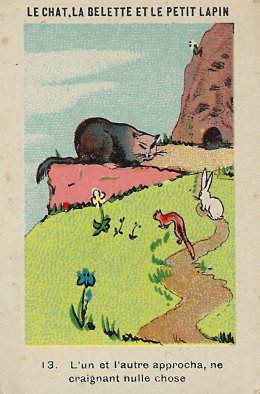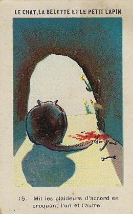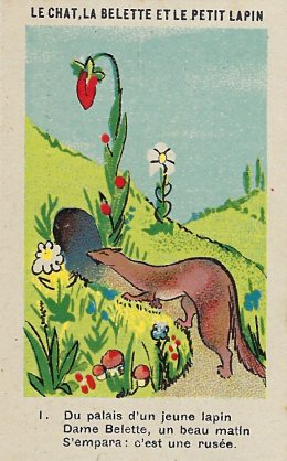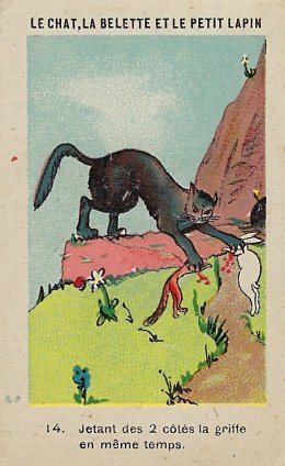 1920? Twelve numbered colored pictorial cards (from a series of 16?) illustrating La Fontaine's fable "Le Chat, la Belette et le Petit Lapin." 2" x 3⅛". Bayon: Chicorée Extra Daniel Voelcker-Coumes. $60 from Bertrand Cocq, Calonne Ricouart, France, Sept., '18.
