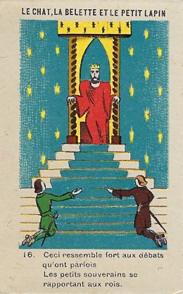 "Card" is almost too strong a word for these thick-paper, small cards. However, the illustrations are executed in careful, loving, lively fashion. It is unusual to have so many cards devoted to presenting one fable. The fable is among the longer La Fontaine fables. Each card presents one or a few verses on its front, along with the title, number, and illustration. The verso features, in its upper half, a numbered commentary on La Fontaine's fable and, in the lower half, an unchanging advertisement for Daniel Voelcker-Coumes and his Chicorée Extra. Black outlines help to define the main characters in each scene. The sometimes minimal changes from one scene to the next are highly effective, for example, when #6 fills in the rats he threatens against the weasel, rats pictured against the same clouds we saw in #5. The same effect is there as the two litigants draw closer to the judge from #12 to #13. These cards are quite different from Daniel Voelcker-Coumes' other series of double cards. - Date