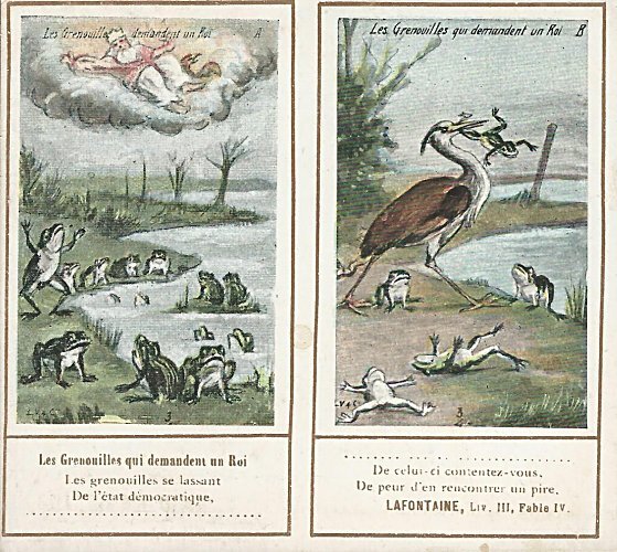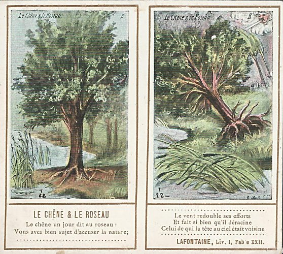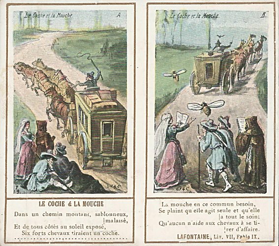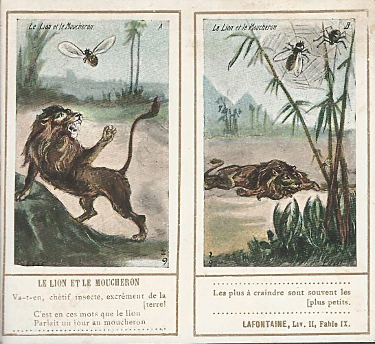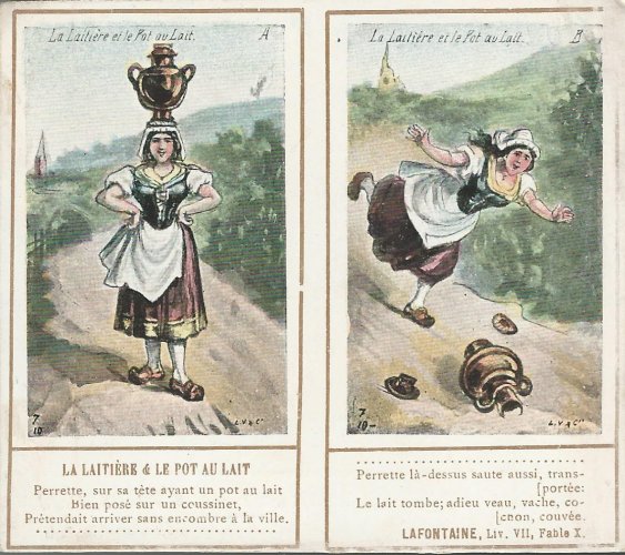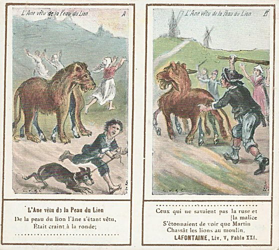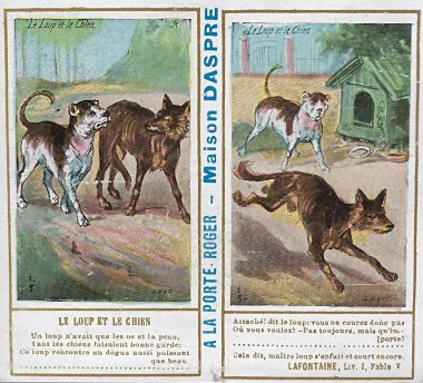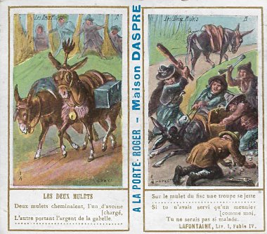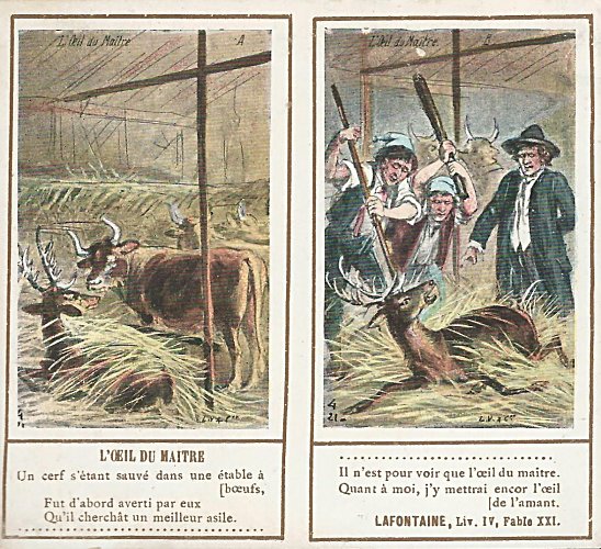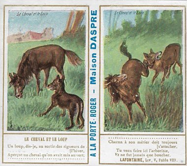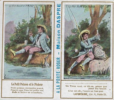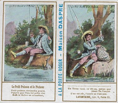 1901? Ten double-cards presenting La Fontaine's fables. Léopold Verger & Cie, Paris. M. Batchelor, Ash, UK, through eBay, August, '13. Four more cards advertising Maison Daspre for $7 each from Bertrand Cocq, Calonne Ricouart, France, Sept., '20.