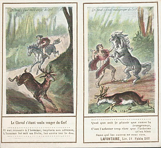 These cards are doubly curious because they reproduce single cards in the series identified in this collection as "Leopold Verger Small." Thus three cards here pick up one image from that series and add a second image of their own. That is the trick in this presentation: two phases give the story of the fable. The verso of the each card is identical.