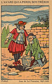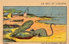 1895? Three colored cards on poor stock presenting La Fontaine's fables: "L'Avare qui a perdu son Trésor," FC, and "Le Rat et l'Huitre." 2½' x 3 7/8". The uniform verso on all three cards advertises a competition "Concours du Petit Ecolier" organized by the Café Imperial in Dreux (E.-et-L.). Printed by Éditions Wartel, Paris-Lille. $15 from Bertrand Cocq, Calonne-Ricouart, France.