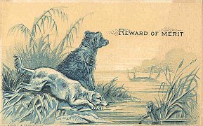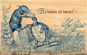 This card, like the two above, includes a prose text of the fable on the back side. The color printing here may be among the best for Wemple and Kronheim cards. Here, as there, "Reward of Merit" tends to have some filigree work around it. It has the fancy "R" found in the card depicting "The Dog and His Master's Dinner." -
