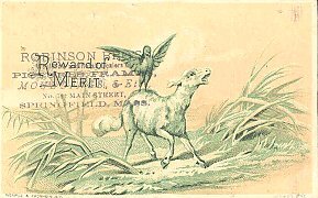 1880? 2 more cards from the green set by Wemple and Kronheim, stamped "Reward of Merit" and then stamped again by Robinson Brothers' Picture Frames of Springfield, MA. $2 each.