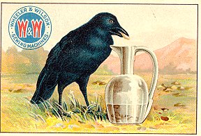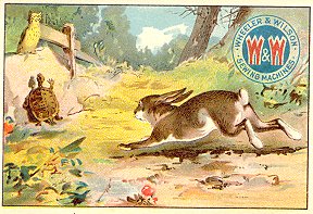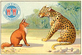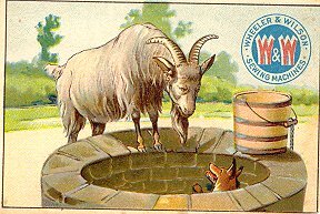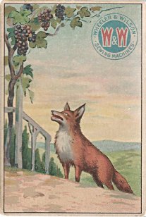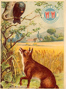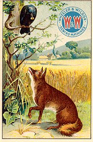 - "The Fox and the Goat." The card is the same as those for Huntington Pianos and Estey Piano Company that I have listed under "1890?" The text on the reverse is exactly the same down to the printing, but no advertising is added. This card was poorly aligned and cut by the printer. On the front, Wheeler & Wilson have a nice logo of two red W's on a blue circle. $5 from Dave Cheadle, Englewood, CO, Sept., '99.