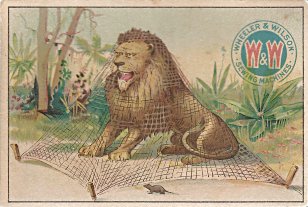 - FC. The design is taken from that used on the Coats (1885?) card in the apparent series of eight. In fact, it may be the same design, cropped to a shorter card (3"x4") and less well printed. There is a text on the reverse. On the front, Wheeler & Wilson have a nice logo of two red W's on a blue circle. Gift of Ford Jacobsen and his mother, Oct., '01.